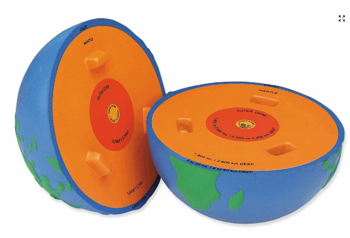 Skummodell av jordkloden med hevede kontinenter. Kan deles i to så man kan se jordens indre med angivelser (miles og km) av dybde og temperatur.