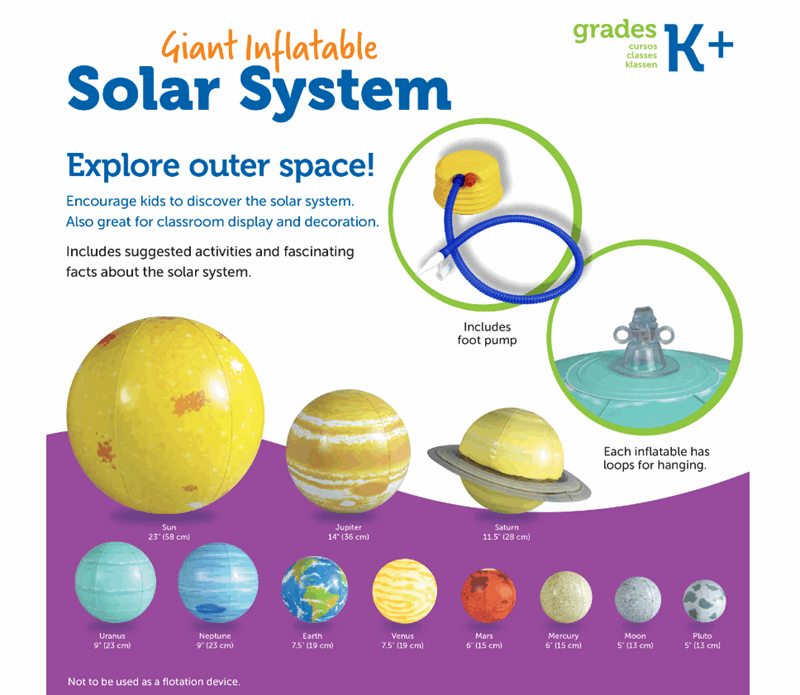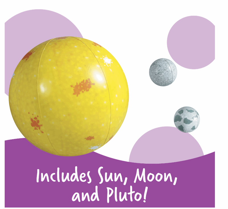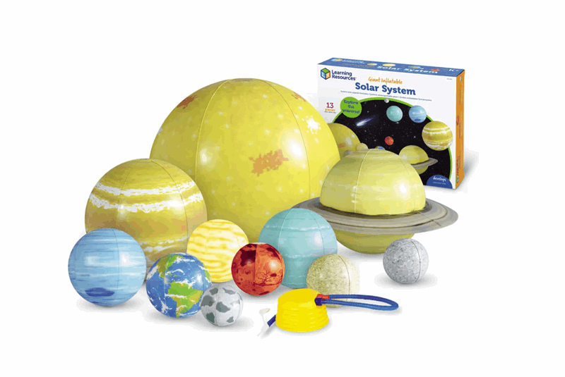 Med dette settet kan du blåse opp solen, månen og de 8 planetene, og deretter ved hjelp av den medfølgende guiden plassere dem eller henge dem opp en bestemt innbyrdes avstand. Settet inkluderer en fotpumpe og hver enhet har en løkke. Dette gir en god forståelse av vårt solsystemt og er svært dekorativt. Det er vanskelig å forestille seg verdensrommet og dette gir barna et godt innblikk i vår plassering i solsystemet.