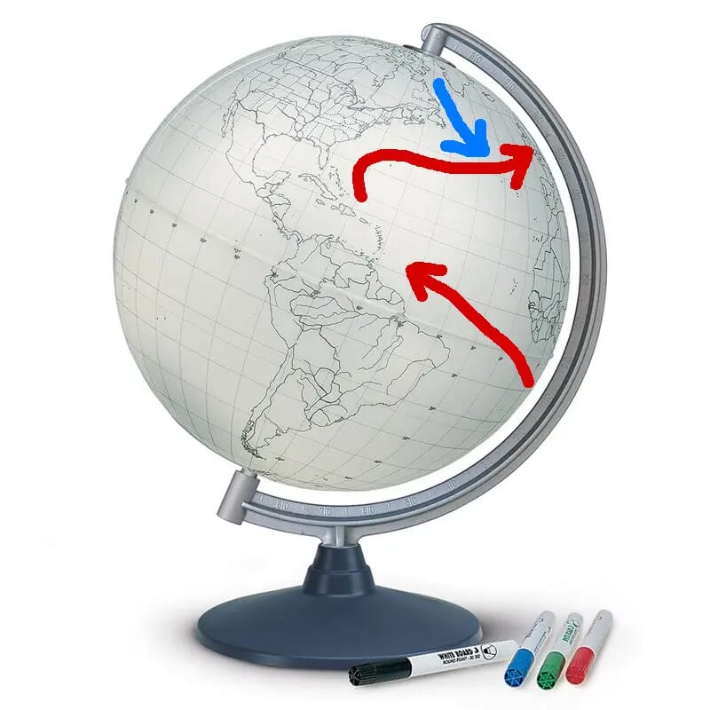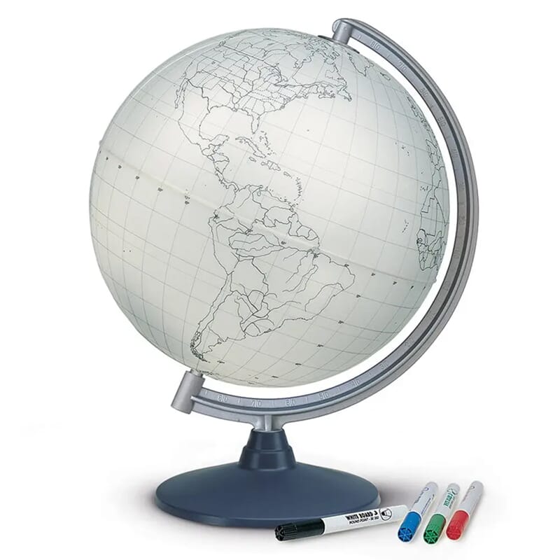 Hvit globus (30 cm diameter) med omriss av kontinenter, store landegrenser og store elver inntegnet. Globusen kan brukes på mange måter, tegn havstrømmer og forstå for eksempel Golfstrømmen, spør hverandre om navn på land, hovedsteder og mye mer! Inkluderer 4 tørkbare tusjpenner i forskjellige farger, slik at du kan tegne direkte på globusen. Globusen er enkel å tørke ren så lenge du bare bruker tusj som kan tørkes av (mange whiteboard-penner kan enkelt tørkes av, men det er lurt å sjekke før bruk).