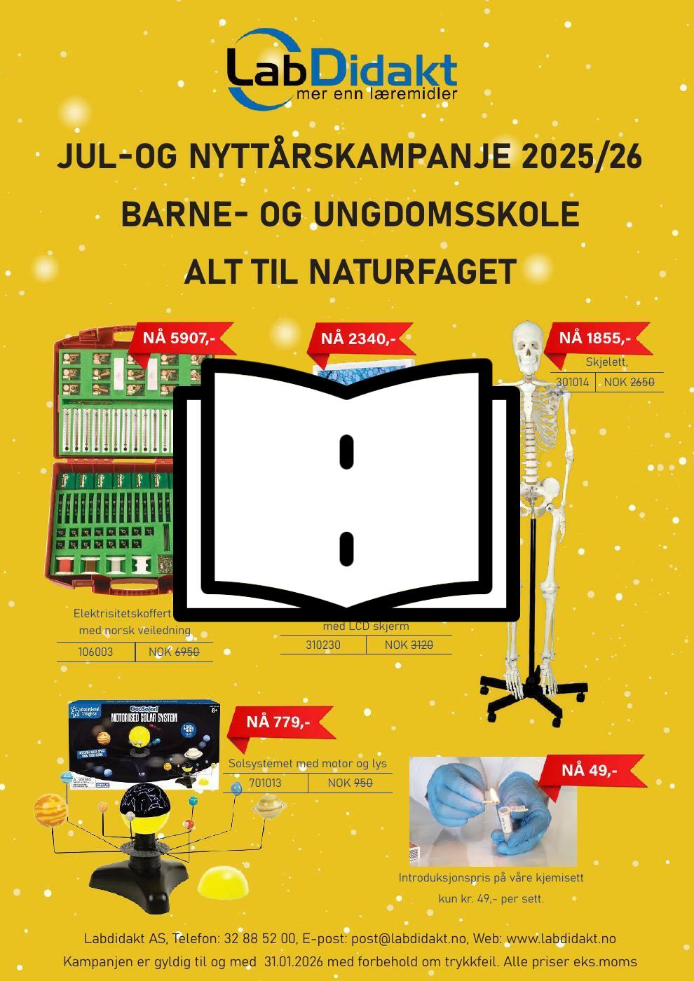 Nå kommer minusgradene, og med det setter vi også minus på prisene! Vår jul- og nyttårskampanje 2025/2026 inneholder hele 24 sider med rimeliger priser som holdes fryst hele veien ut januar. Vi følger opp intensjonene i de nye læreplanene med tilbud både på kjente og etablerte produkter og på spennende nyheter innenfor koding, kjemi, biologi og mer til. Her gjelder det å holde hodet kaldt!