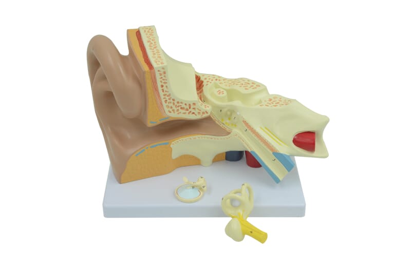 Modellen er 3 ganger forstørret og gir mulighet for å studere ørets anatomi i detalj. Du kan ta ut trommehinne, hammer, ambolt og stigbøyle som en del, sneglehus og balanseorgan som en annen.