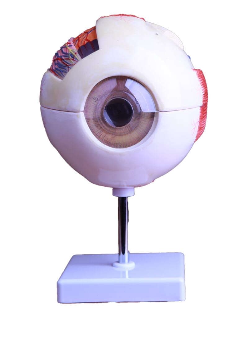 Modellen er 3x forstørret, er montert på stativ og kan deles i 6 deler. Ytterst er senehinne med hornhinne og øyemuskler, deretter årehinne med iris og