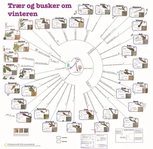 Trær og busker om vinteren, bestemmelsesduk, med farge