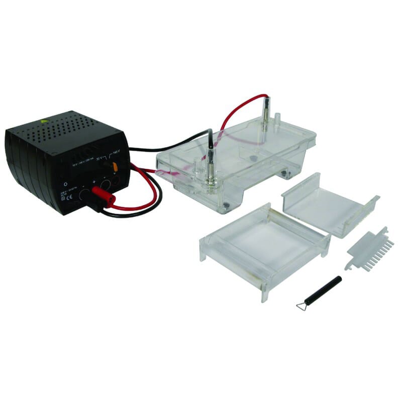 Komplett sett til elektroforese, inkluderer spenningskilde og elektroforesekar. Egner seg godt til DNA-elektroforese med agarosegel og protein-elektroforese. Utstyret er enkelt i bruk og godt sikret. Kan brukes med de fleste undervisningssett sett som tilbys skolemarkedet.