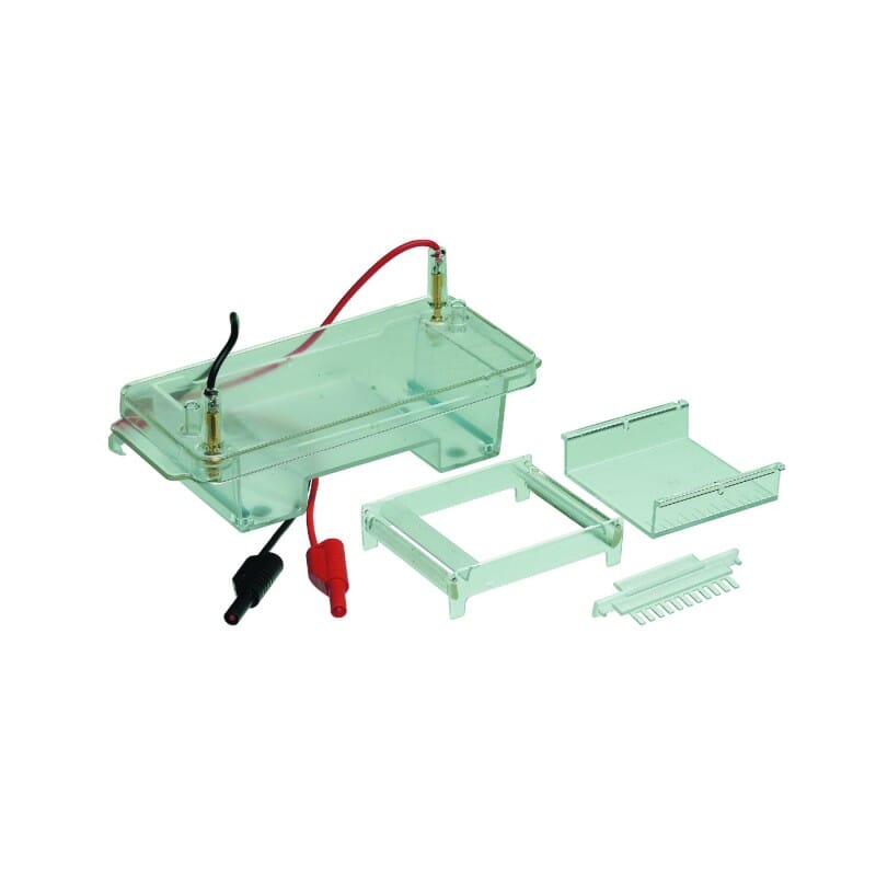 Solid elektroforesekar med sikret lokk spesielt utviklet for undervisningsbruk. Inkludert er sikkerhetskabler for tilkobling til spenningskilde.