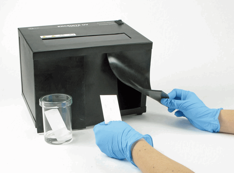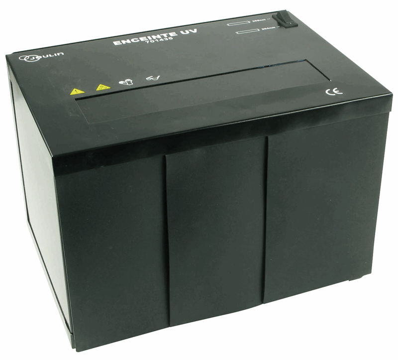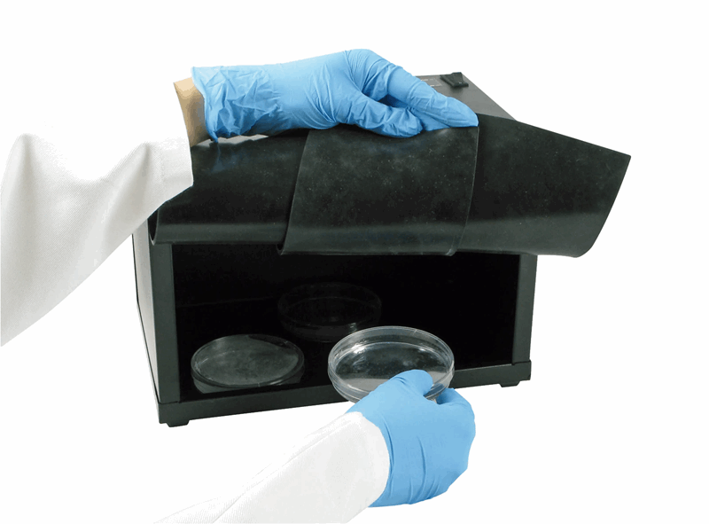 Praktisk UV-bestrålingsboks med fleksibel åpning foran som gjør det enkelt å innføre TLC-plater eller petriskåler. Observasjonsvinduet på toppen lar deg følge med på TLC-prosessen. Kammeret har plass til opptil tre petriskåler for bestråling.