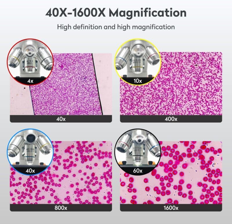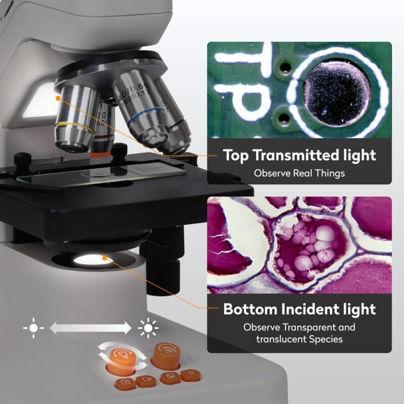 Med en 7-tommers 1080P IPS-berøringsskjerm som kan vippes 135°, og et 8 MP-kamera, gir det skarpe og detaljerte bilder av mikroskopiske objekter. Mikroskopet er utstyrt med fire objektiver (4x, 10x, 40x, 60x), noe som muliggjør en digital forstørrelse på opptil 1600x. Den presise X-Y-mekaniske scenen og dobbel LED-belysning (transmittert og reflektert lys) sikrer optimal observasjon av både transparente og ugjennomsiktige prøver.