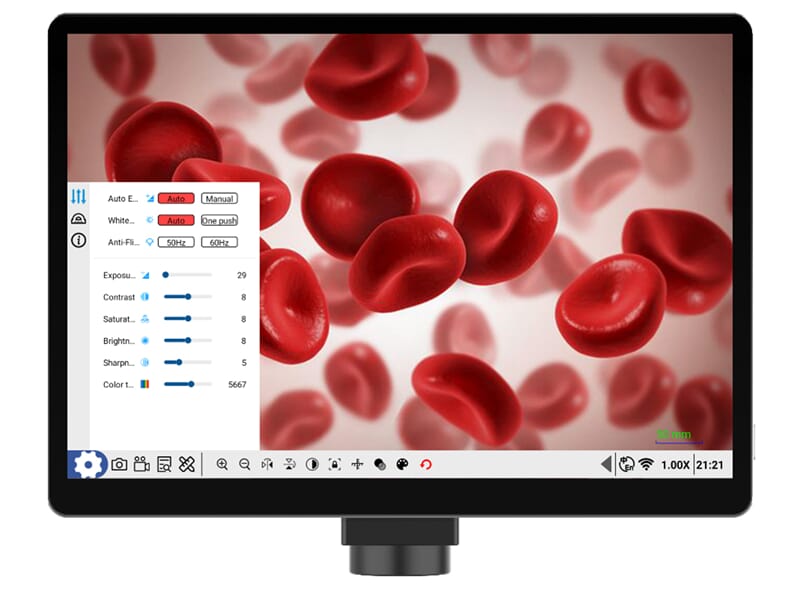 10,5" LCD-berøringsskjerm med integrert 8MP/4K digitalkamera for mikroskoper og stereoluper. Kameraet plasseres i okulartubusen og vil fungere fint uansett om du bruker en av de skråstilte okulartubusene eller den vertikale som man har på et trinokulært mikroskop da det kan justeres trinnløst til den posisjonen man ønsker.