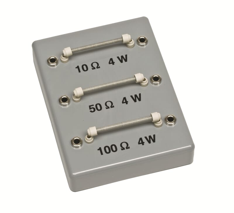 Kvalitetsmotstander fra Cornelsen Experimenta som tåler hele 4W. Tre robuste motstander, 10, 50 og 100 Ohm, montert på stabil plate. Tilkobling med standard lab-ledning med bananstikk. Egner seg godt for forsøk hvor man ønsker en motstand som tåler mer strømstyrke, slik som eksempel Ohms lov.