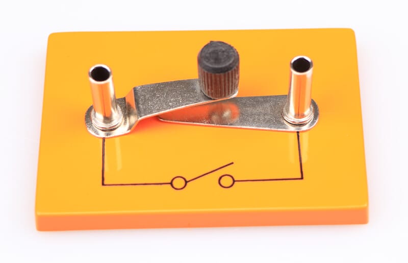 Trykkbryter montert på plate (50 x 70 mm) for bruk i elektrisk kretser. Bøssinger for 4 mm bananstikk.