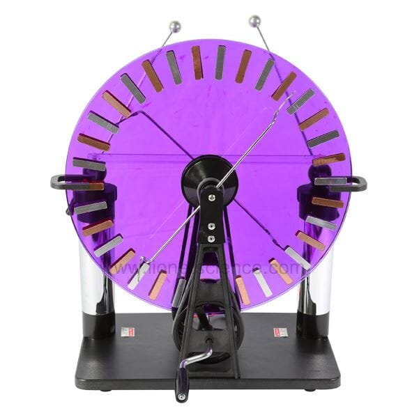 Et klassisk apparat for å generere høy spenning på laben. Stor modell hvor de store skivene er hele 40 cm. Ved å sveive slik at de store skivene roterer motsatt av