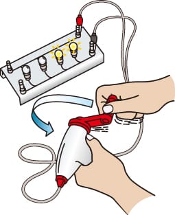 Plate med fire lyspærer i parallel og terminal på begge ender. Når en av endene får elektrisitet vil lyspærene lyse opp i rekkefølge, den ene etter den andre. Bruk Narikas Genecon håndgenerator og føl hvordan motstanden øker når du prøver å lyse opp alle lyspærene!