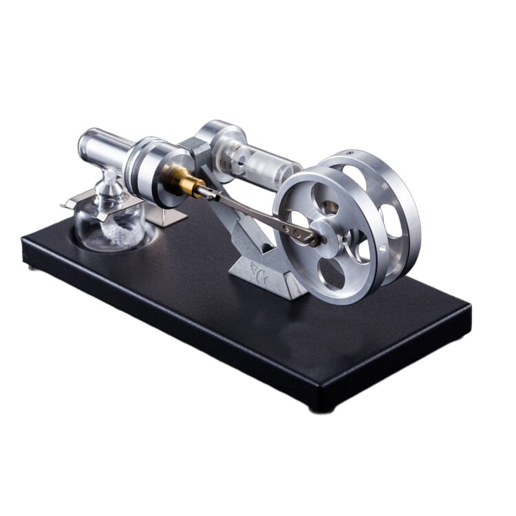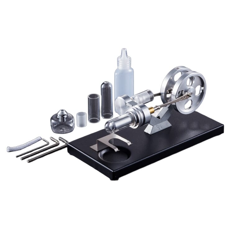 Denne funksjonelle Stirlingmotoren gir et nærbilde av Stirling-syklusprinsippet med sine aktive stempler og glassylindre. Fyll litt denaturert alkohol i brenneren og tenn opp. Etter en kort oppvarmingstid vil motoren gå.