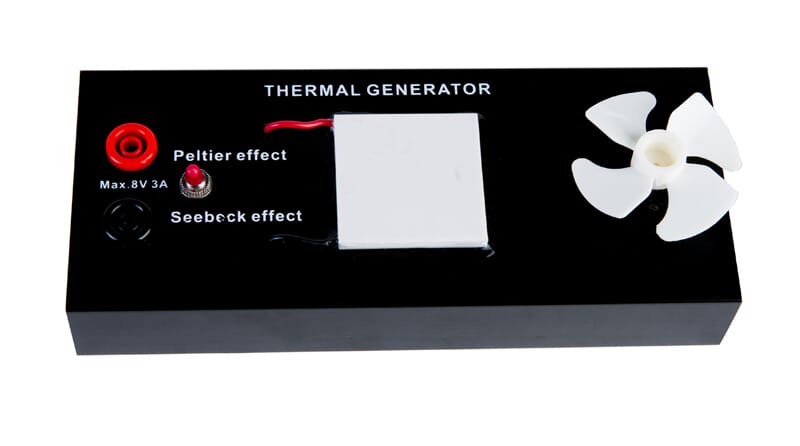 Peltier-elementet genererer en spenningsforskjell dersom det er en temperaturforskjell mellom de to sidene av elementet. Dette kan demonstreres ved at man plasserer et begerglass med varmt vann på platen. Etter et halvt minutt kan man demonstrere spenningsforskjellen som har oppstått ved at propellen går. Tar du begerglasset av platen vil propellen raskt stoppe. Hvis du påtrykker en spenning 8V/3A) vil dette resultere i at temperaturen på platen går ned eller opp. Disse to prosessene kalles henholdsvis Seebeckeffekt og Peltiereffekt.
