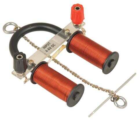 U-formet jernkjerne med åk og krok. På jernkjernen er det viklet isolert kobbertråd tilkoblet standard bananbøssinger.