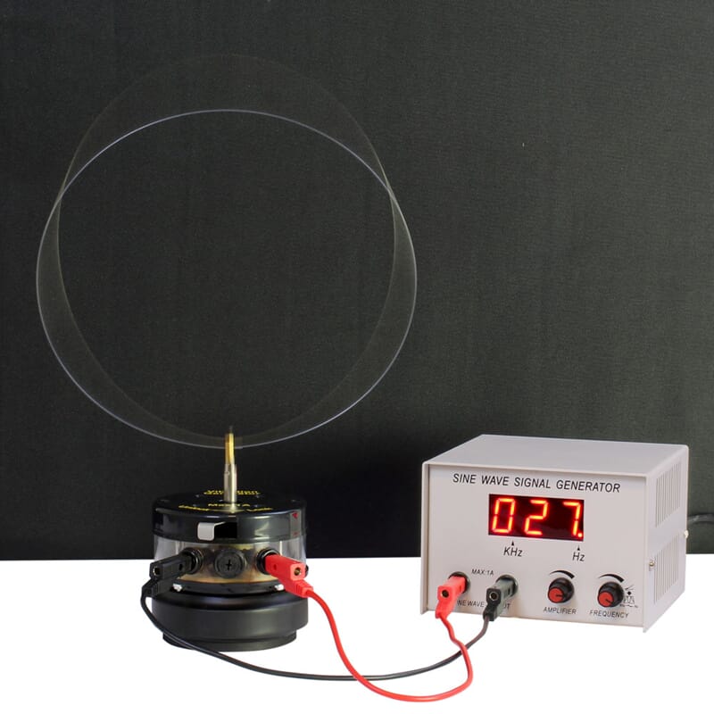 En enkel funksjonsgenerator, med kun to brytere for innstilling av frekvens og amplitude. Generatoren har store lettleste tall for avlesing av frekvensen. Bruk generatoren sammen med vibrator (107067) og annet tilleggsutstyr som fjær, gummisnor og pianotråd for å studere stående bølger, forskjellen på longitudinelle- og transverse bølger og mye annet. Kan også tilkobles høyttaler for å høre lyd ved ulike frekvenser.