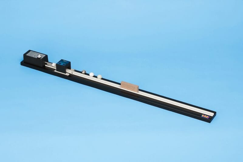 Et apparat fra Narika som viser hvordan kinetisk energi overføres fra et objekt til et annet. Når kulen skytes fra hengslet rampe på den ende enden med justerbar kraft, treffer den treklossen som så seiler avgårde langs platen. Mål hastigheten på ballen med fotocelle og distansen på treklossen med påmontert skala og se hvordan det henger sammen. Dobbel fotocelle for hastighetsmåling, føringsskinne, trekloss og tre ulike kuler er inkludert.