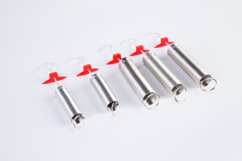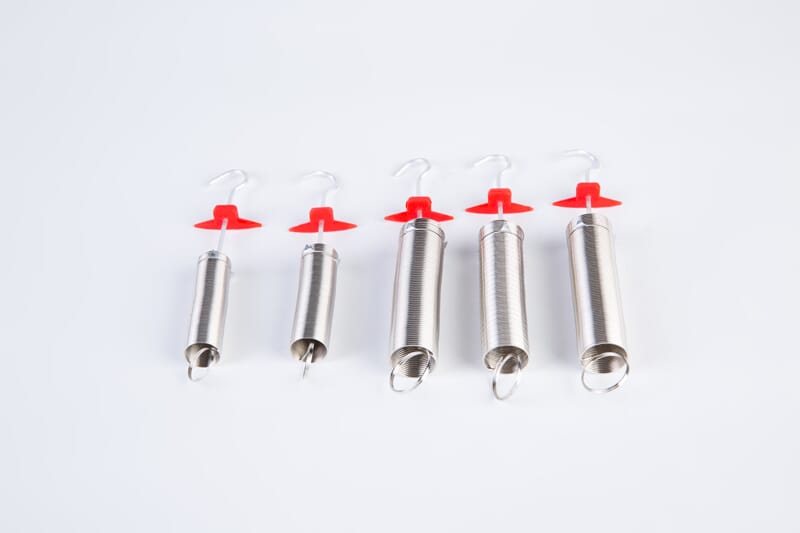 Sett med 5 ulike fjærer. I den ene enden har fjæra et øye og i den andre enden er fjæra utstyrt med krok.