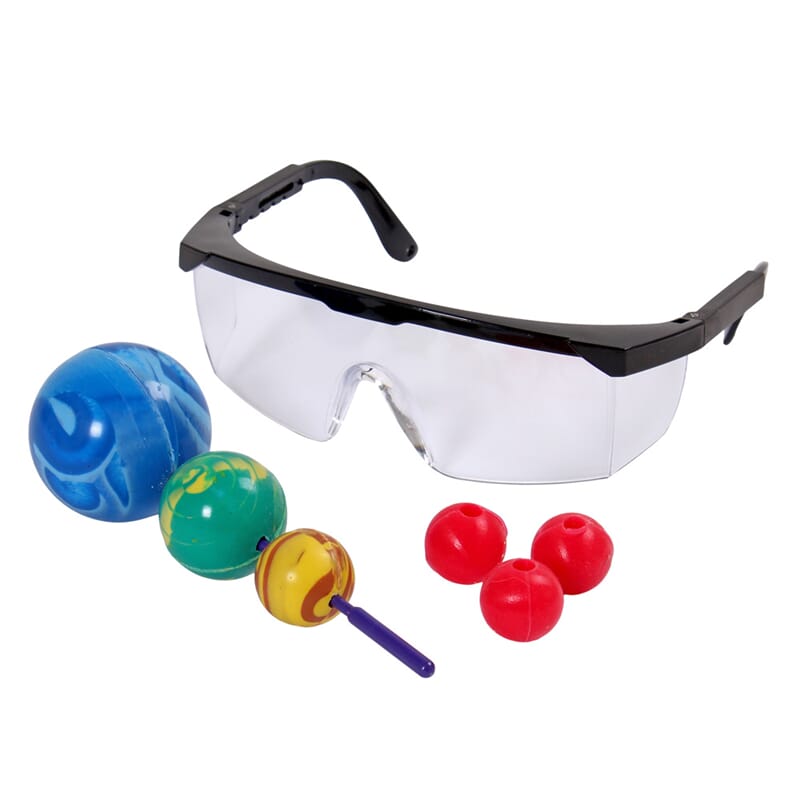 Fire gummiballer av ulik størrelse er tredd på en stang og kun den minste ballen er «fri». Løft opp gummiballene ved å ta tak i toppen av pinnen og slipp dem i gulvet fra ca. 1 meters høyde. Observer hva som skjer med den minste ballen etter støtet. Når den største ballen når gulvet vil den sprette opp igjen og overføre sin bevegelsesmengde til den neste. Fordi massen er mindre vil farten bli større og den minste ballen vil sprette mange meter til værs. Sprør gjerne elevene i forkant om hva de tror vil skje. Den minste ballen får stor fart så benytt gjerne en vernebrille (inkludert).