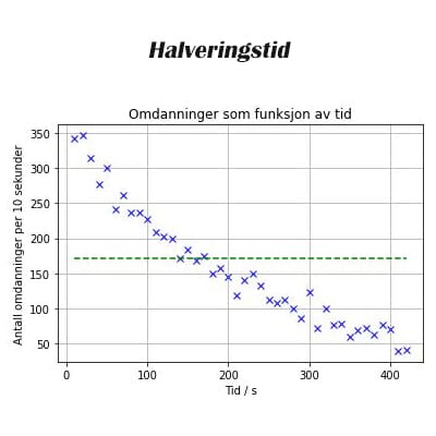 I dette forsøket skal vi bruke en PASCO trådløs GM-sensor og måle strålingen fra den radioaktive isotopen Ba-137. Formålet med øvelsen er å finne isotopens halveringstid, altså tiden det tar før den radioaktive aktiviteten er halvert. Deretter skal vi importere dataene i Python og skrive en kode som leter etter halveringstiden og angir den både ved tallverdi og ved et plott. Vi har laget en enkel og en avansert løsning og angir den enkle her. Den avanserte finner du i kodearkivet.