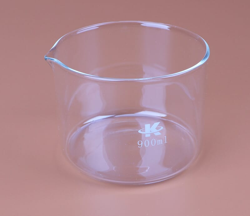 Stor krystallisasjonsskål i varmebestandig borosilikatglass, type 3.3. Skåla er utstyrt med helletut for å unngå søl.