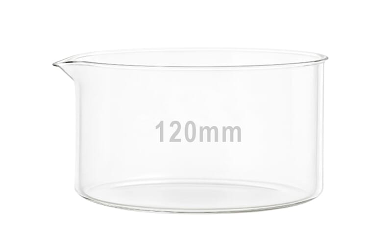 Stor krystallisasjonsskål i varmebestandig borosilikatglass, type 3.3. Skåla er utstyrt med helletut for å unngå søl.
