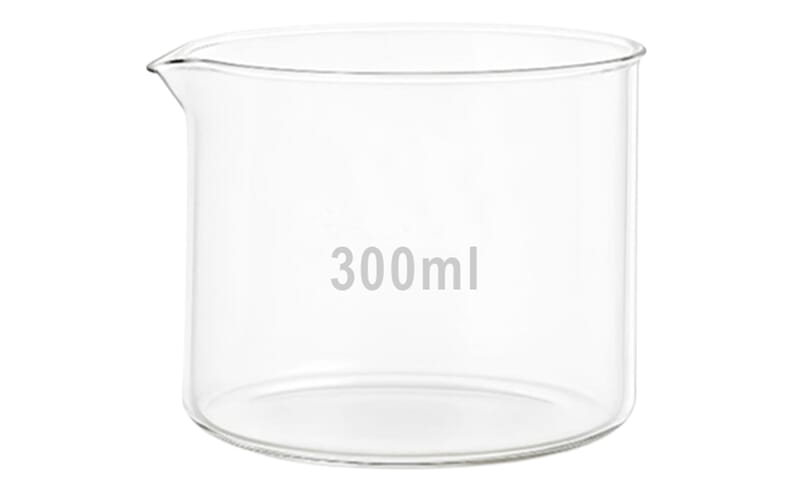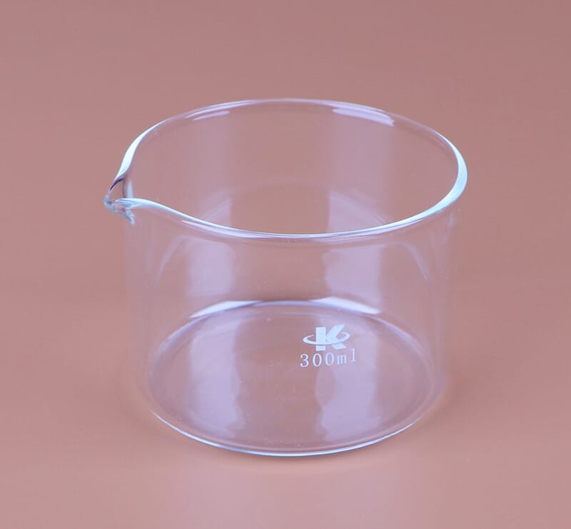 Stor krystallisasjonsskål i varmebestandig borosilikatglass, type 3.3. Skåla er utstyrt med helletut for å unngå søl.