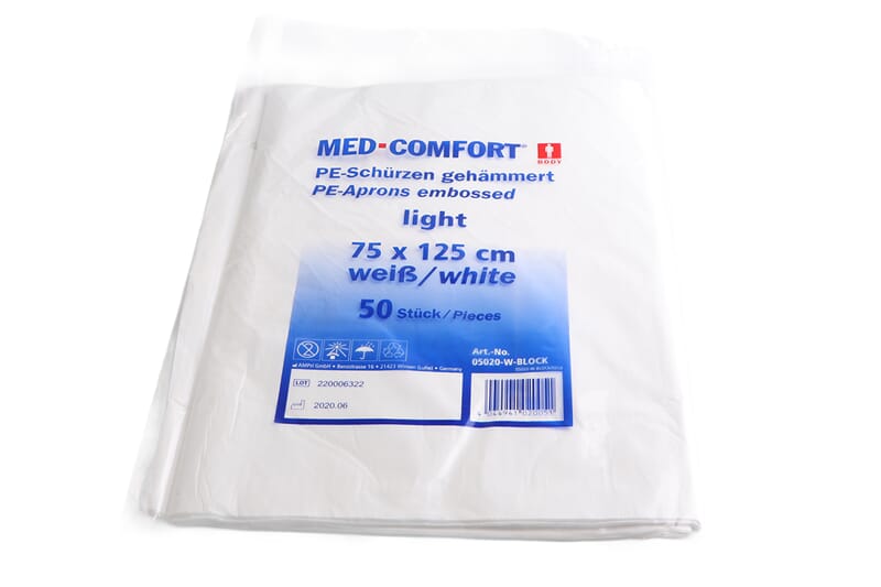 Engangs laboratorieforklær i hvit PE plast.