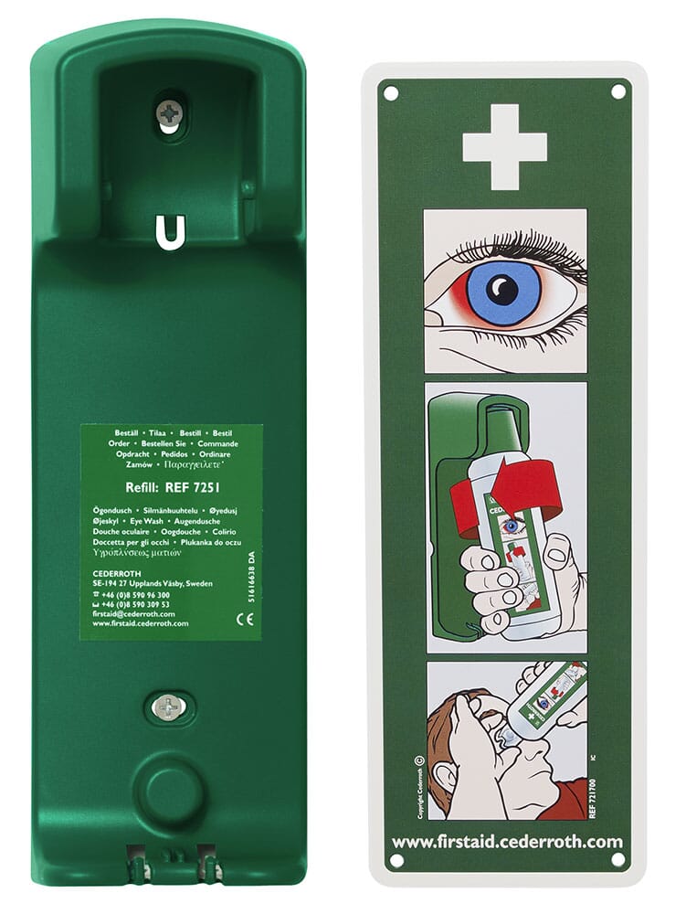 • Innhold: 1 stk. veggholder for 500 ml Øyevaskeflaske (art.nr: 204010, bestilles separat) samt 1 stk. etterlysende instruksjonsskilt.