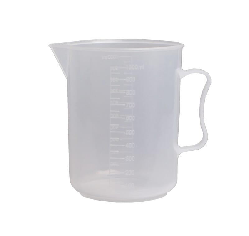Målemugge i gjennomsiktig plast med håndtak og helletut. For måling av større volumer der nøyaktigheten ikke er så avgjørende.