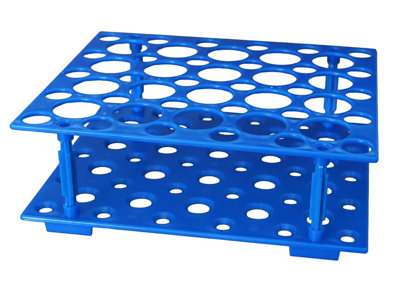Kjekt reagensrørstativ som er tilpasset reagensrør med skrulokk 50 ml (202035), men som også kan plasseres opp ned for å holde mindre reagensrør.