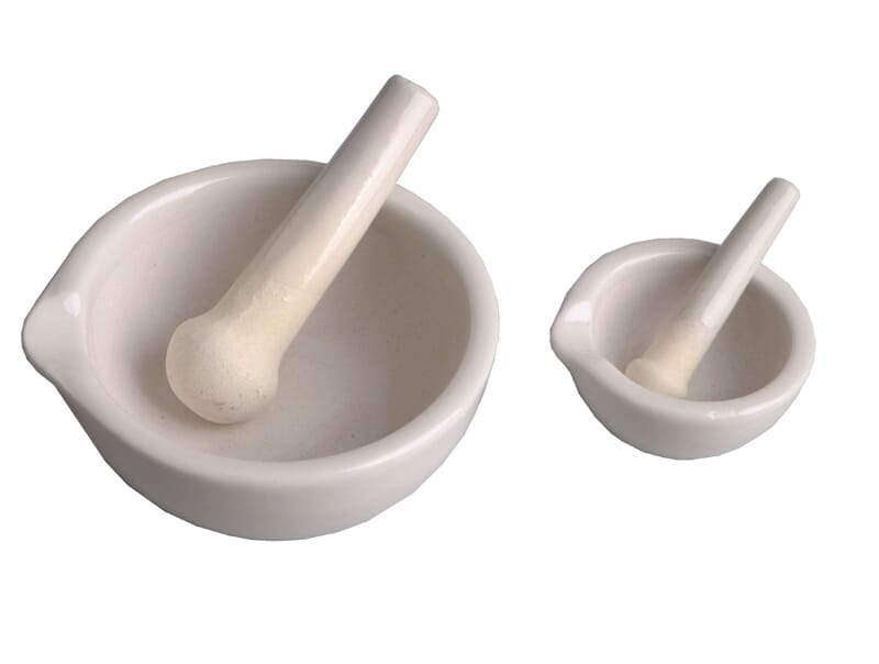 Morter med pistill i diameter 60 mm. Innvendig del av morter og kulen er ikke glasert.