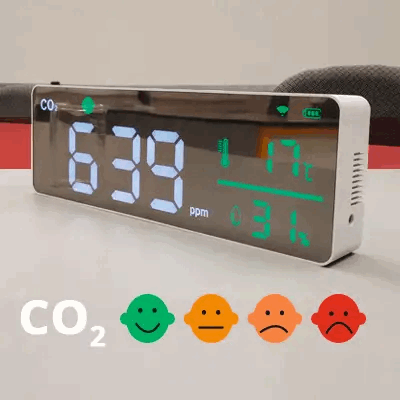 CO2-måler til allsidig bruk. Lett og bærbar, men kan også monteres på vegg. Skjermen er stor og lett å lese, med stor skrift slik at CO2-nivå kan leses på avstand og piktogrammer for å raskt indikere hva CO2-nivået tilsier. I tillegg måler den også temperatur og luftfuktighet, og kan kobles til WiFi for fjernlesing med app. Måleren er utstyrt med både synlig og hørbar alarm som kan justeres i trinn på 100 ppm.
