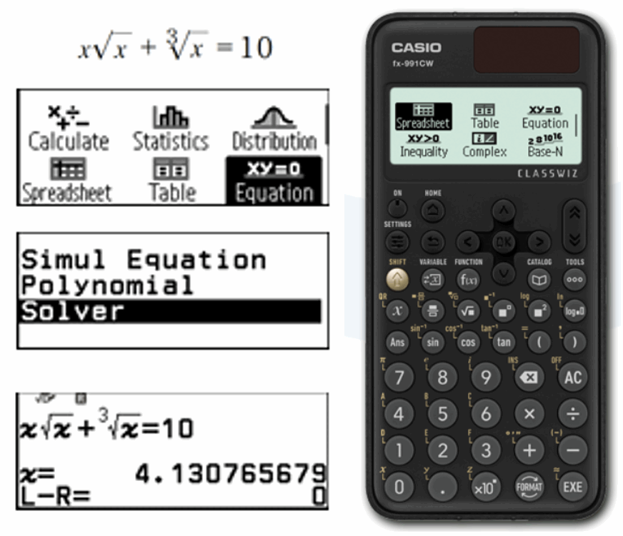 FX-991CW er storebror i ClassWiz-familien. Den har alle de samme funksjonene som FX-82CW og FX-85CW, og i tillegg en rekke nyttige funskjoner som gjør den perfekt til deg som vil satse litt ekstra på matematikken. Kanskje den aller mest brukte tilleggsfunksjonen er likningsløseren. FX-991CW kan løse "alle" likninger, inkludert avanserte trigonometriske likninger med en spesiell SOLVE-funksjon. Den har selvsagt "ABC" formelen og kan løse likningsett ved å benytte en ferdig mal. FX-991CW har også et bibliotek med vitenskapelige konstanter, og blir fort et uvurderlig verktøy på laben for deg som planlegger å studere realfag! Se gjerne i oversikten for alle ekstrafunksjoner FX-991CW har å by på.