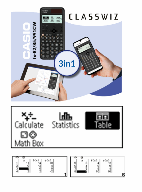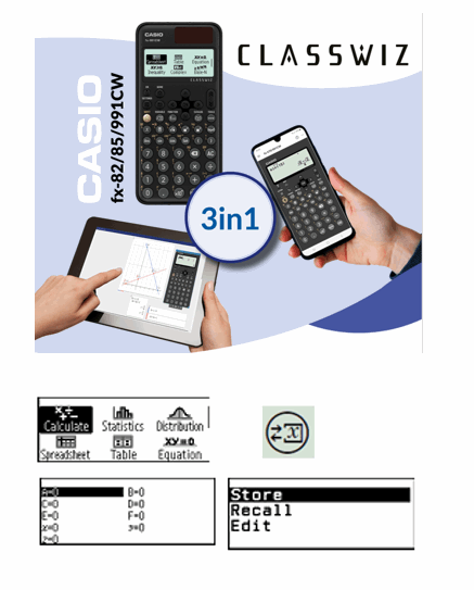 Liste for variabler, 9 variabler, primtallsfaktorisering, tilfeldig heltall generator, koordinattransformering, potenser, trigonometriske funksjoner, brøkregning, kombinasjoner og permutasjoner, statistikk (editor for listedata, standard avvik, regresjonsanalyse, statistiske beregninger for variabel 1 og 2), tabellfunksjon, angrefunksjon, naturlig læreboksdisplay, flerlinjedisplay, QR-kode