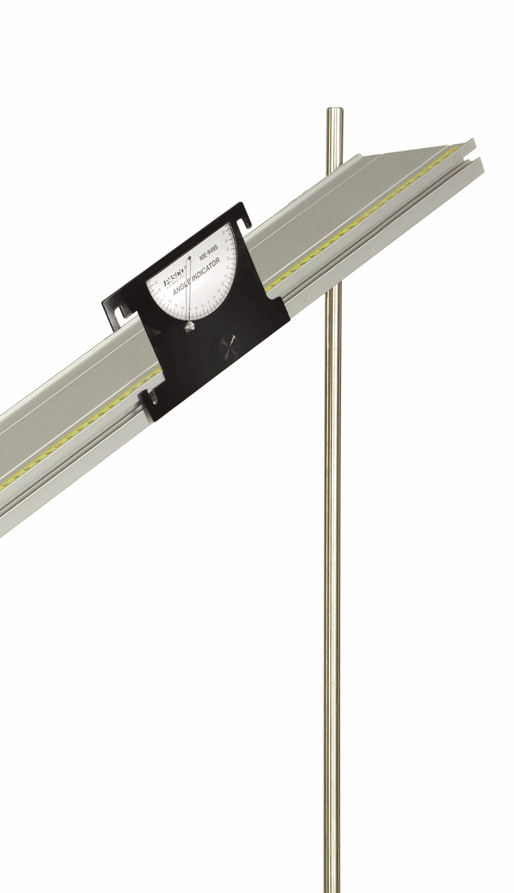 Praktisk hjelpemiddel som kan festes til alle PASCOs dynamikkbaner. Et lite snoropphengt lodd sammen med en tydelig skala gjør det enkelt å lese av helningen med en nøyaktighet på 0,5 grader.