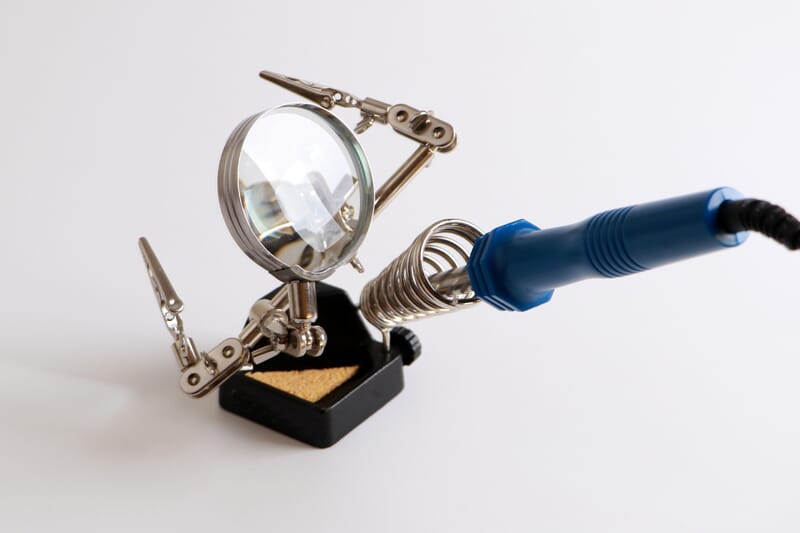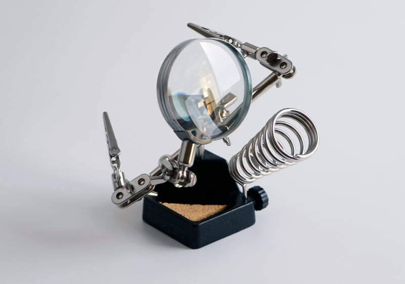 Praktisk stasjon for lodding som både gir deg "en hjelpende hånd" og forstørrelse av komponenterene som skal loddes sammen.